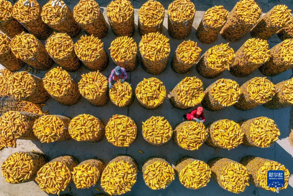 10月9日,河北省遵化市劉備寨鄉農民將收獲的玉米裝入糧囤儲藏(無(wú)人機照片)。
