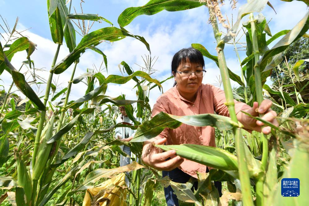 楊寧在采摘今年試種的新品玉米(10月8日攝)。新華社記者 黃孝邦 攝