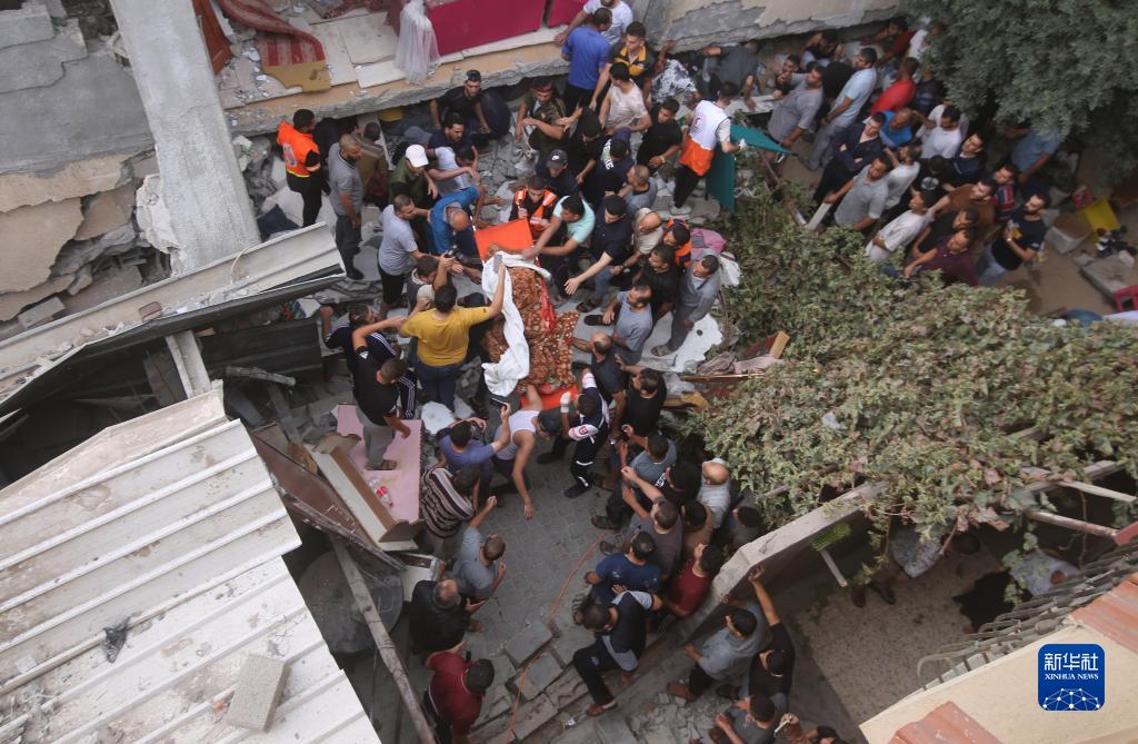 10月9日,在加沙地帶南部城市拉法,人們從以色列空襲后的建筑中抬出一名搜尋到的受害者。