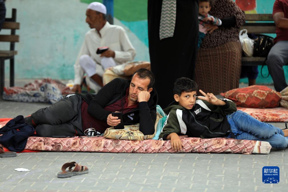 10月9日,巴勒斯坦人在加沙地帶南部城市汗尤尼斯的一所學(xué)校躲避以色列空襲。