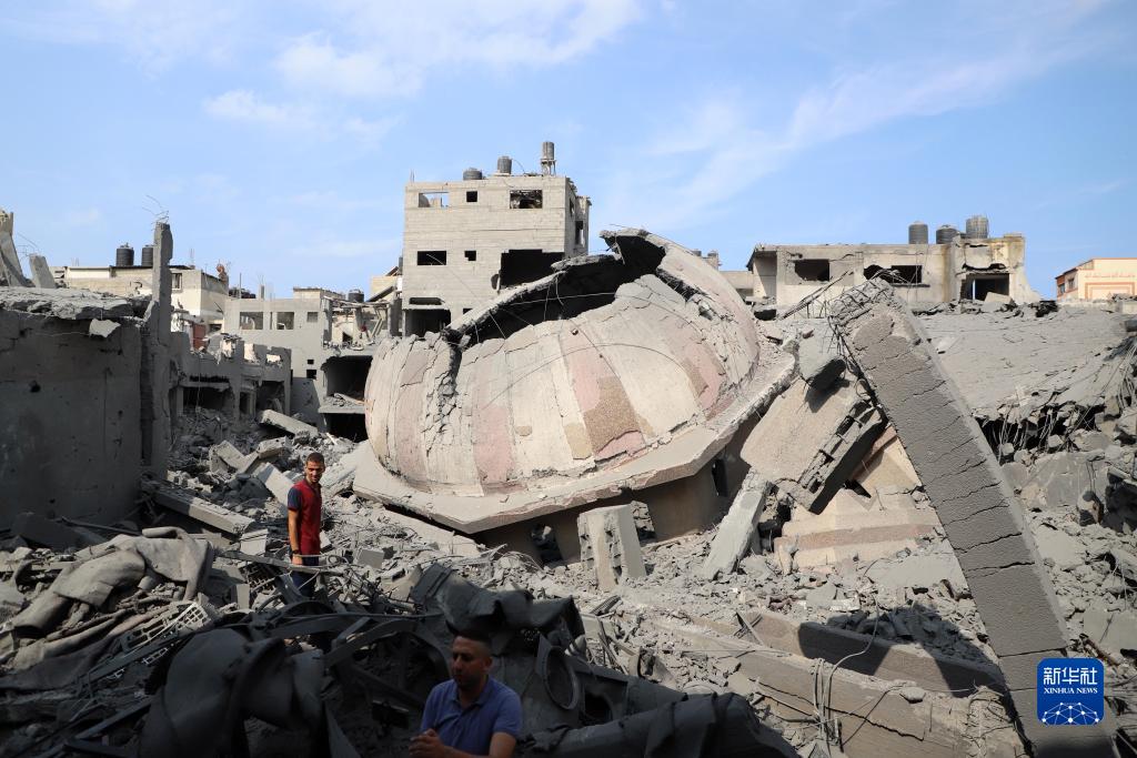 這是10月9日在加沙城拍攝的被以色列空襲炸毀的建筑廢墟。