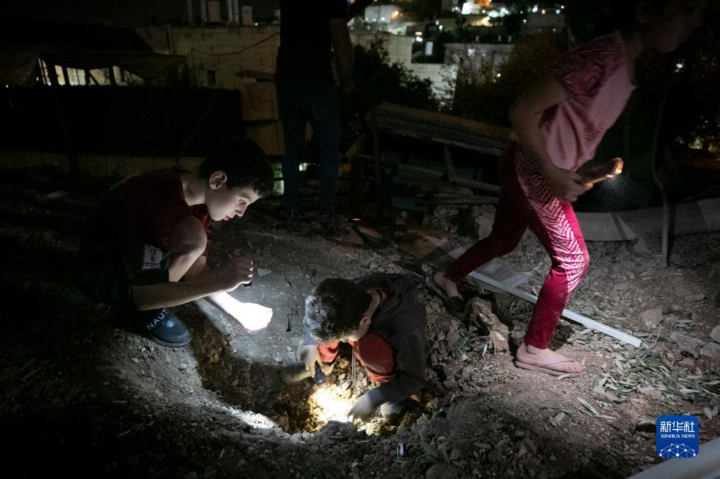 10月9日,在耶路撒冷以西的阿布高什村,幾名兒童在火箭彈彈坑旁查看。