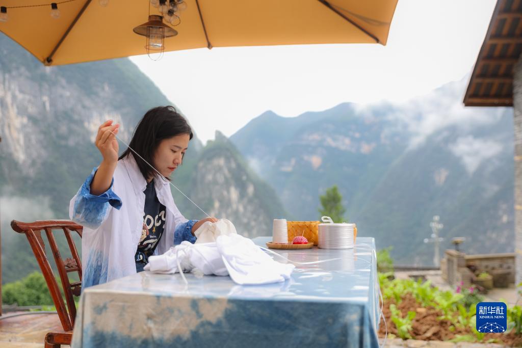 10月10日,在重慶市巫山縣竹賢鄉下莊村,袁孝鑫在創(chuàng )作扎染圖案。