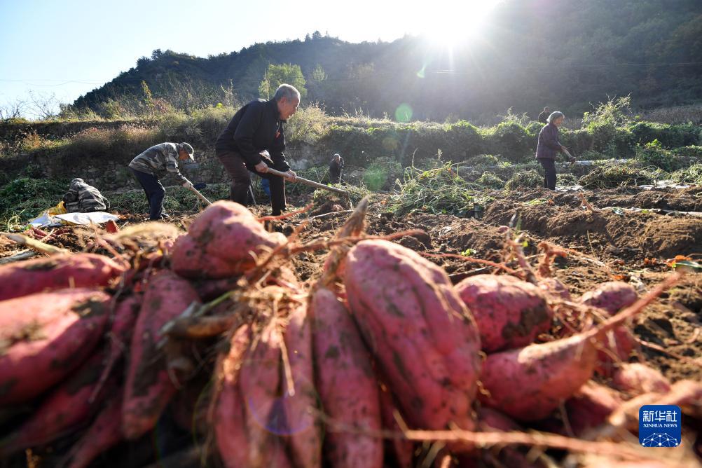 10月10日,河北省石家莊市平山縣孟家莊鎮上莊村農民在收獲紅薯。
