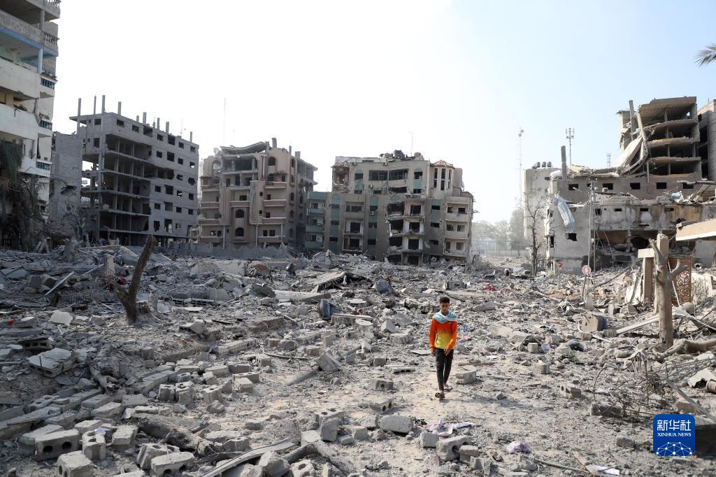 這是10月10日在加沙城拍攝的被以色列空襲炸毀的建筑廢墟。