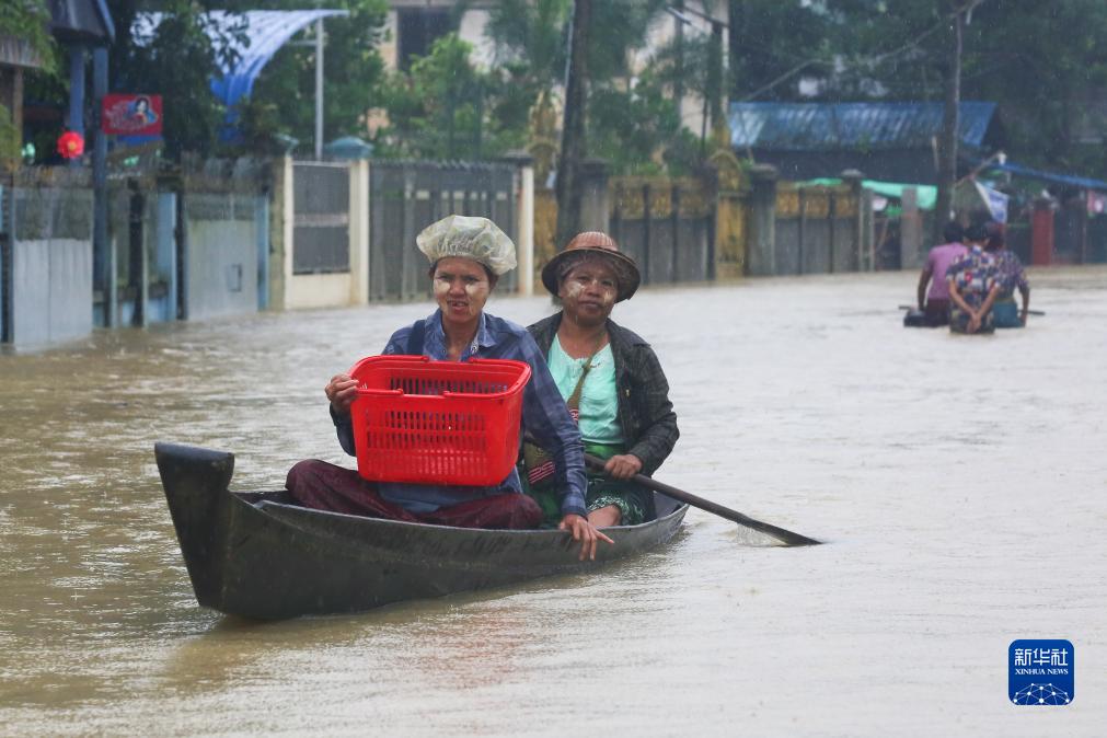 10月10日,在緬甸勃固地區,人們在積水的道路上乘船出行。
