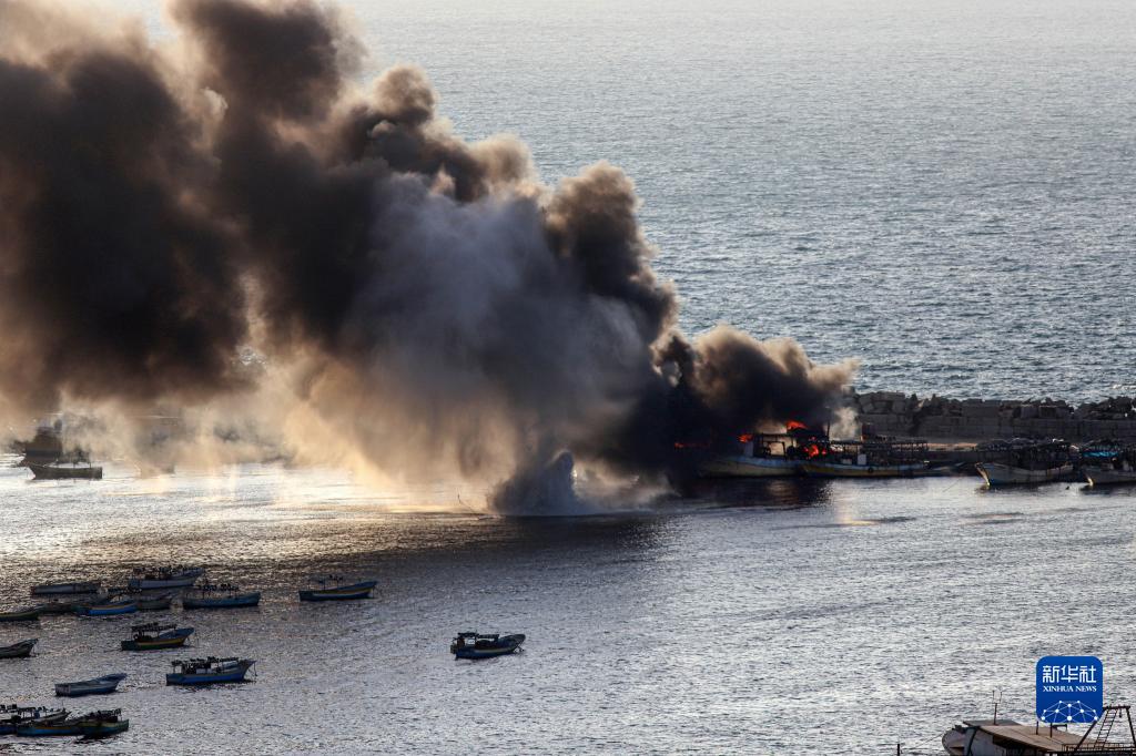 10月10日,加沙城港口遭以色列襲擊后升起濃煙。