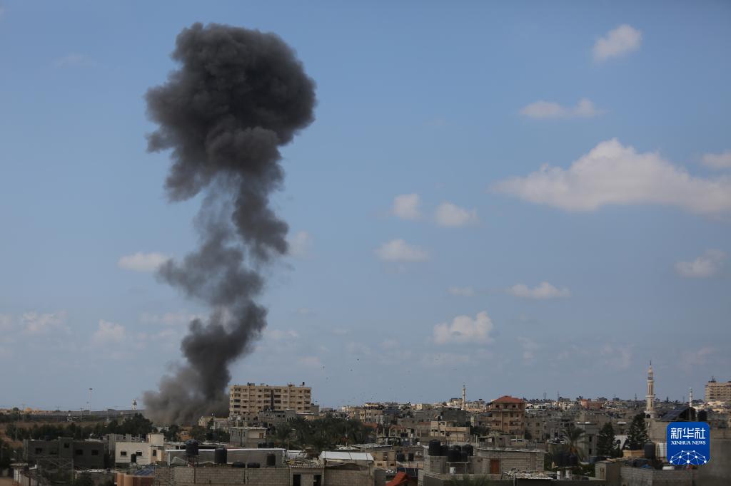 10月10日,加沙地帶與埃及接壤的拉法口岸遭以色列空襲后冒出滾滾濃煙。