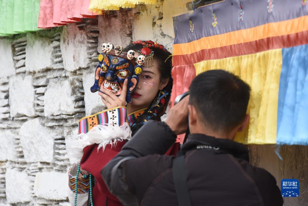 10月10日,在四川甘孜藏族自治州理塘縣,游客在街頭拍照。