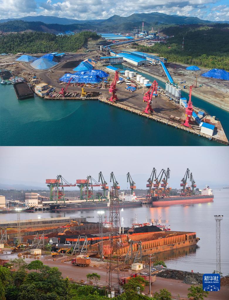 拼版照片顯示,上圖:這是2016年9月23日在印度尼西亞中蘇拉威西省拍攝的青山工業(yè)園自備碼頭(新華社記者 杜宇 攝);下圖:這是2022年9月23日在印度尼西亞中蘇拉威西省拍攝的中國印尼綜合產(chǎn)業(yè)園青山園區港口(新華社記者 徐欽 攝 )。