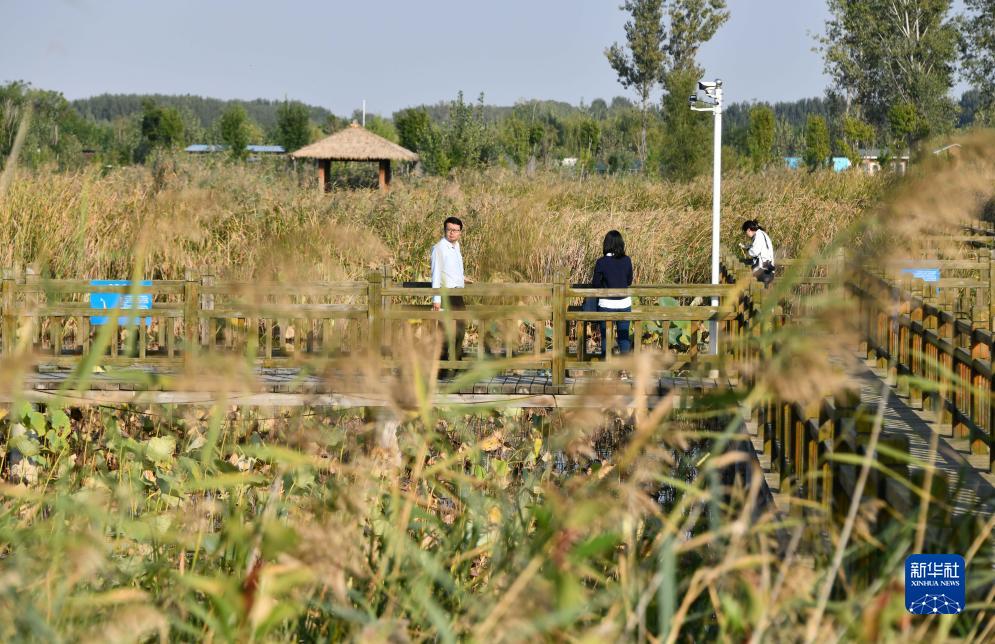 10月10日,游客在山東聊城位山黃河公園里游覽。