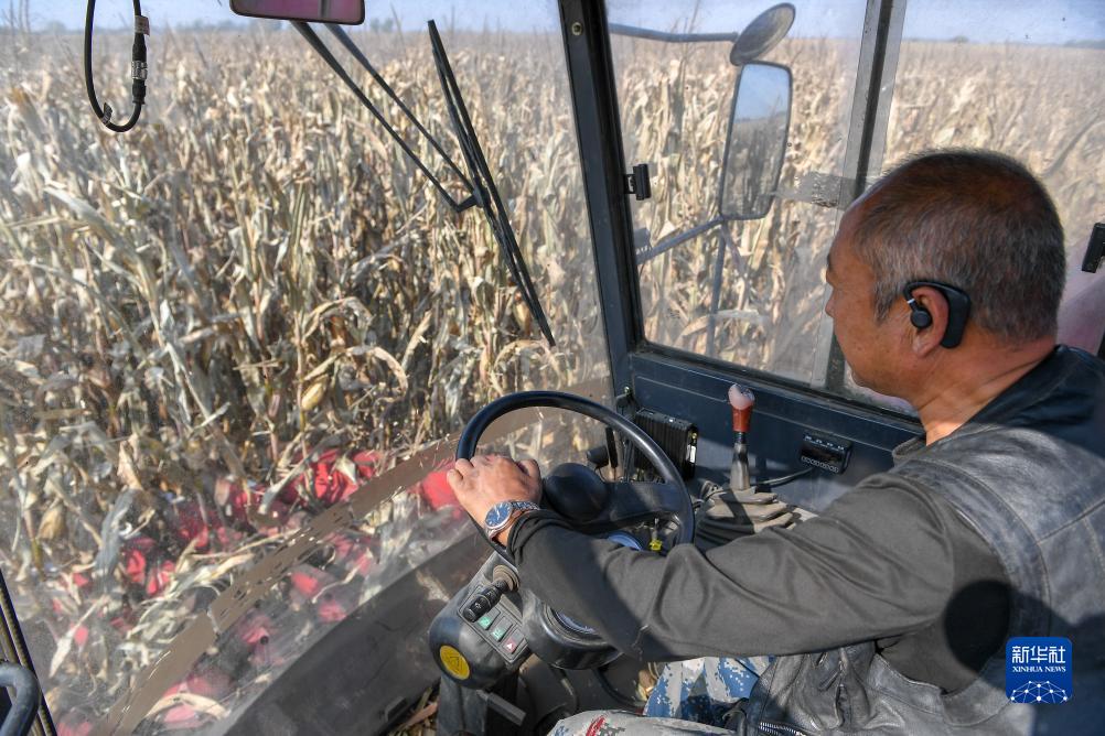 10月11日,在吉林省公主嶺市范家屯鎮乾程農民專(zhuān)業(yè)合作社,農民操作農機收獲玉米。