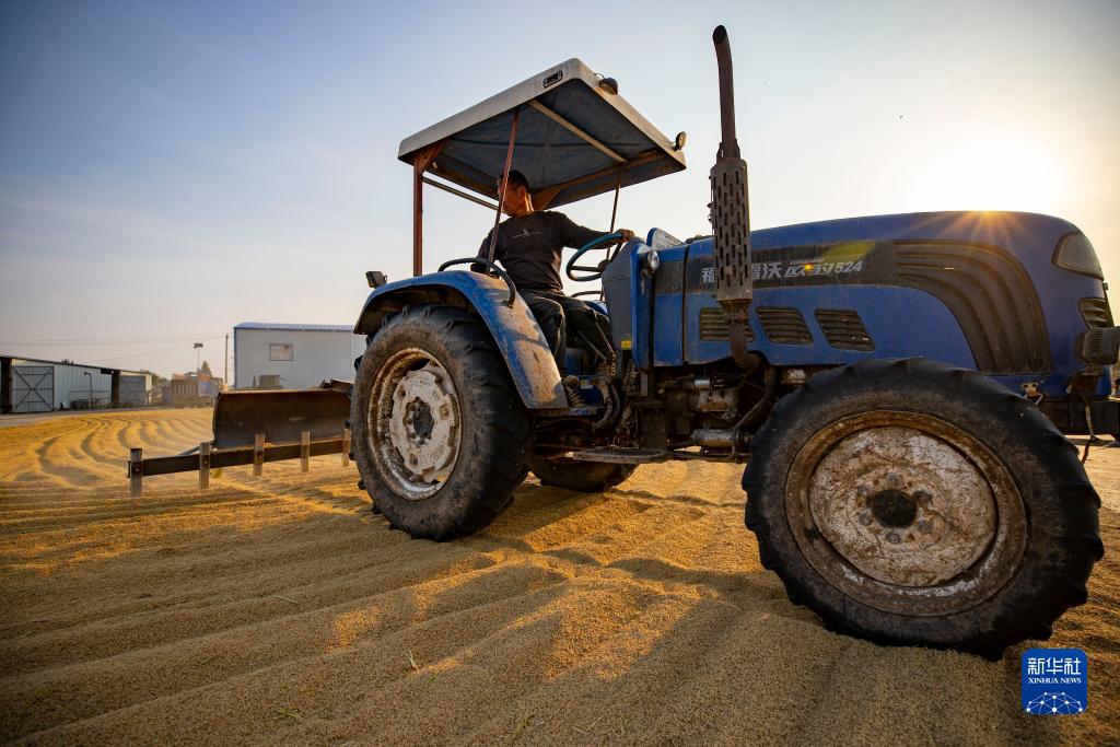 在寧夏銀川市賀蘭縣立崗鎮通義村,農民操作機械在曬場(chǎng)勞作(10月10日攝)。