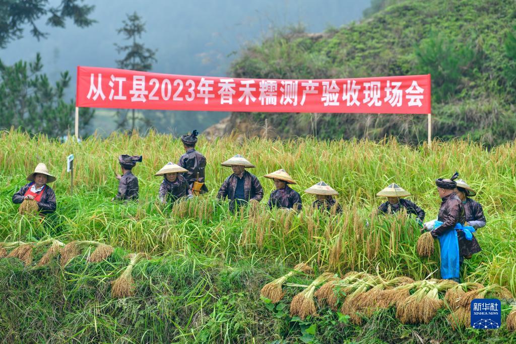 10月11日,在貴州省從江縣高增鄉建華村香禾糯測產(chǎn)現場(chǎng),村民采收香禾糯稻谷。