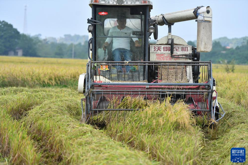 10月11日,在湖南省長(cháng)沙市望城區烏山街道維梓村,農戶(hù)駕駛收割機在農田里收割水稻。