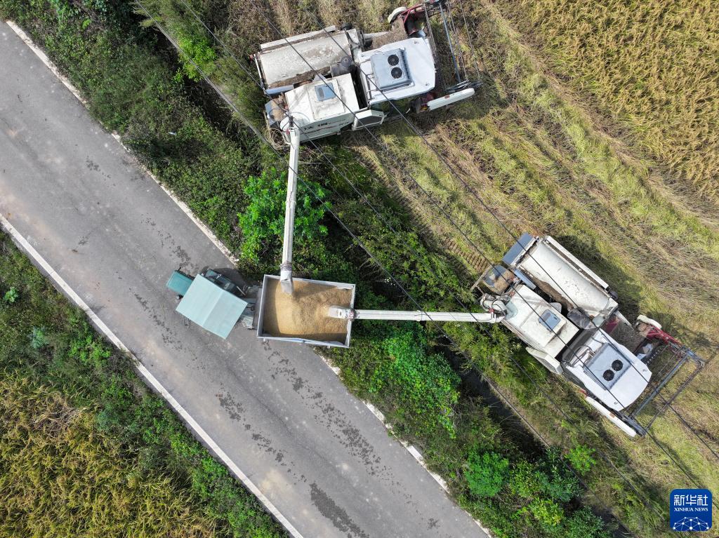 10月11日,在湖南省長(cháng)沙市望城區烏山街道維梓村,農戶(hù)將稻谷裝車(chē)(無(wú)人機照片)。