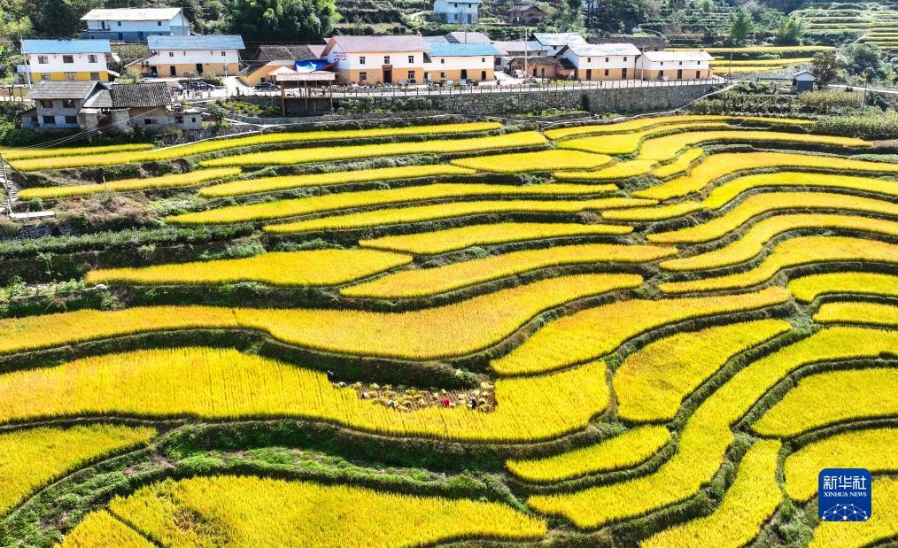 10月11日,湖北省宜昌市秭歸縣沙鎮溪鎮長(cháng)春村村民在田間收獲高山冷水稻(無(wú)人機照片)。