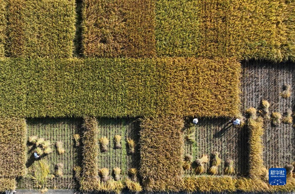 10月11日,農民在江蘇揚州市農科院的試驗田里勞作(無(wú)人機照片)。