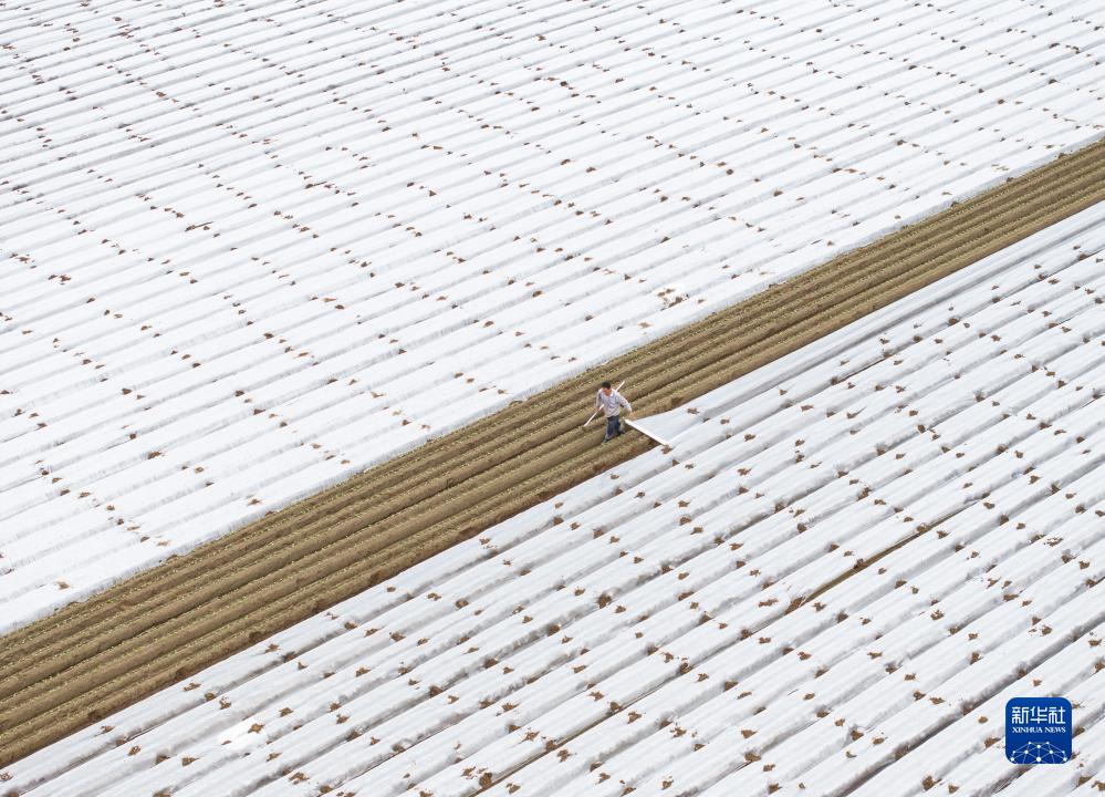 10月11日,在蓬安縣錦屏鎮中壩社區蔬菜種植基地,村民在田地里覆地膜(無(wú)人機照片)。
