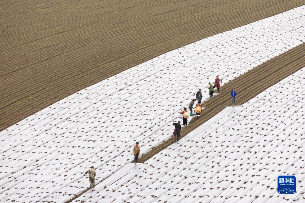 10月11日,在蓬安縣錦屏鎮中壩社區蔬菜種植基地,村民在田地里覆地膜。