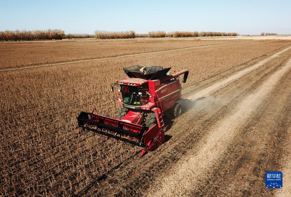 10月11日,收割機在黑龍江省富錦市一大豆地塊收獲大豆(無(wú)人機照片)。