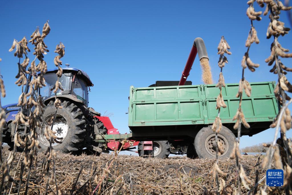 10月11日,在黑龍江省富錦市一大豆地塊的地頭,收割機卸下剛收獲的大豆。