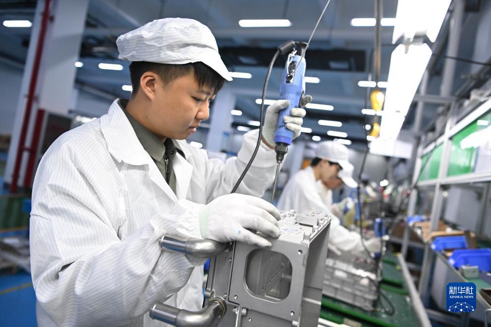 10月11日,河北元氏縣一家壓縮機生產(chǎn)企業(yè)工人在生產(chǎn)線(xiàn)上組裝空氣壓縮機。