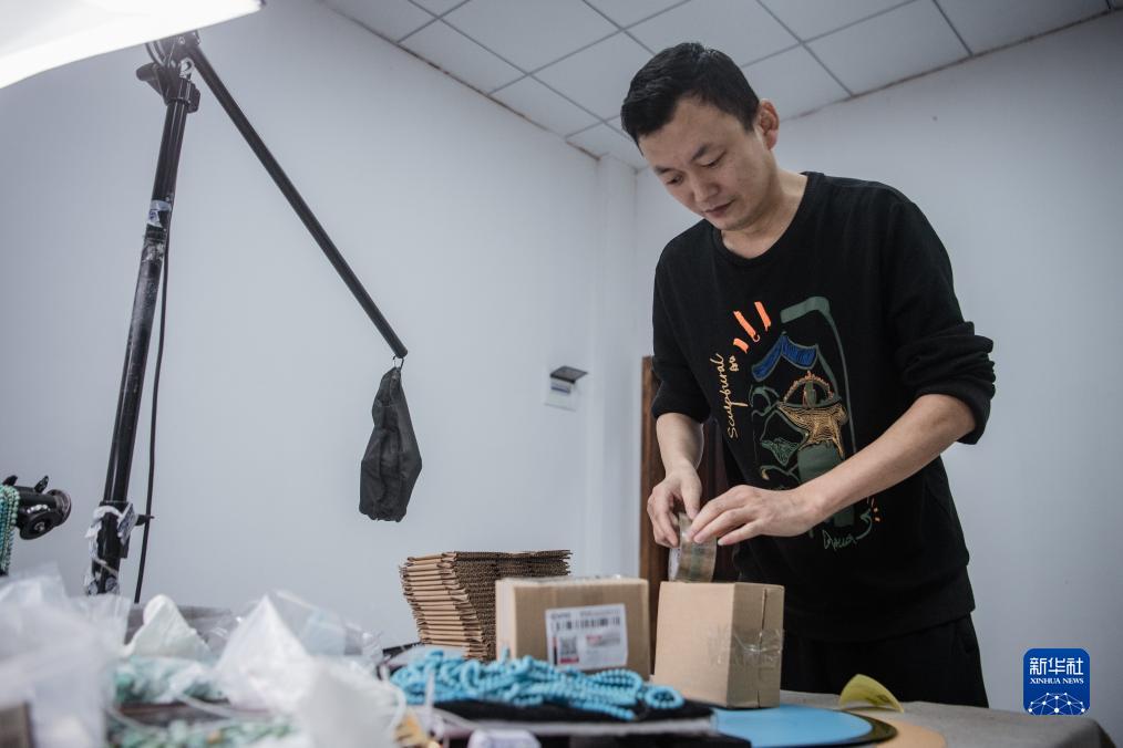10月11日,湖北省鄖西縣下?tīng)I村村民鐘磊將綠松石制品打包準備發(fā)貨。