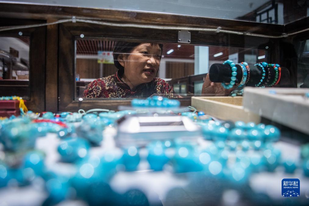 10月11日,湖北省鄖西縣下?tīng)I村村民郭明鳳在介紹自己展銷(xiāo)柜臺內的綠松石制品。