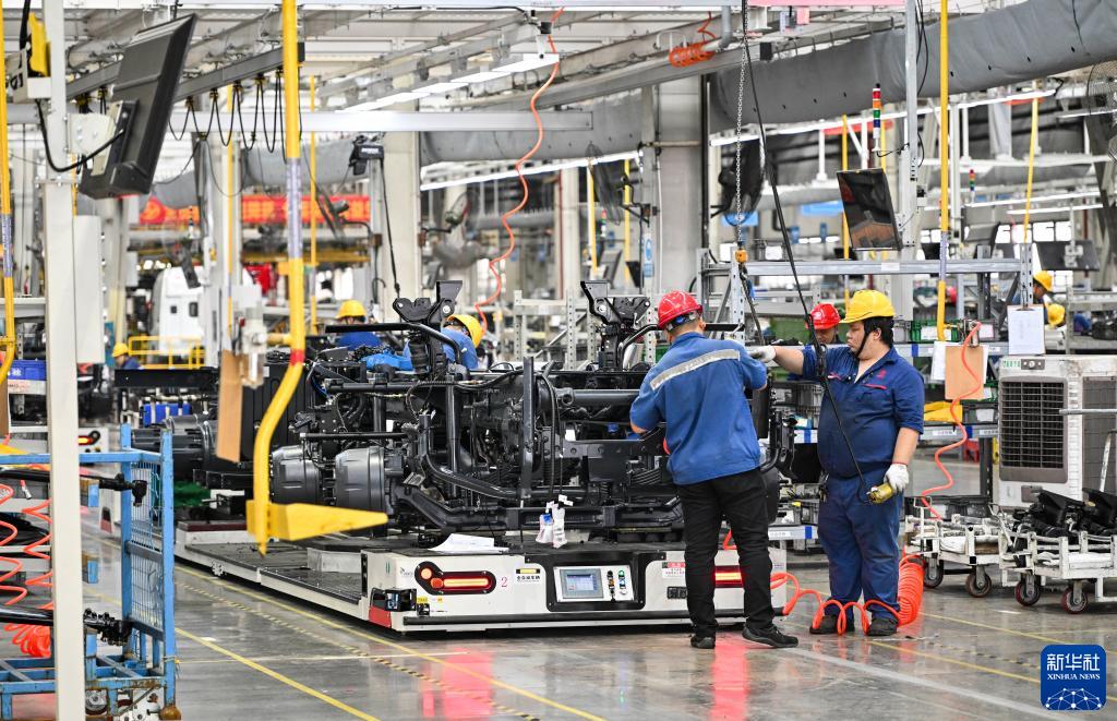 9月26日在位于重慶市兩江新區的上汽紅巖汽車(chē)有限公司總裝車(chē)間拍攝的生產(chǎn)作業(yè)現場(chǎng)。