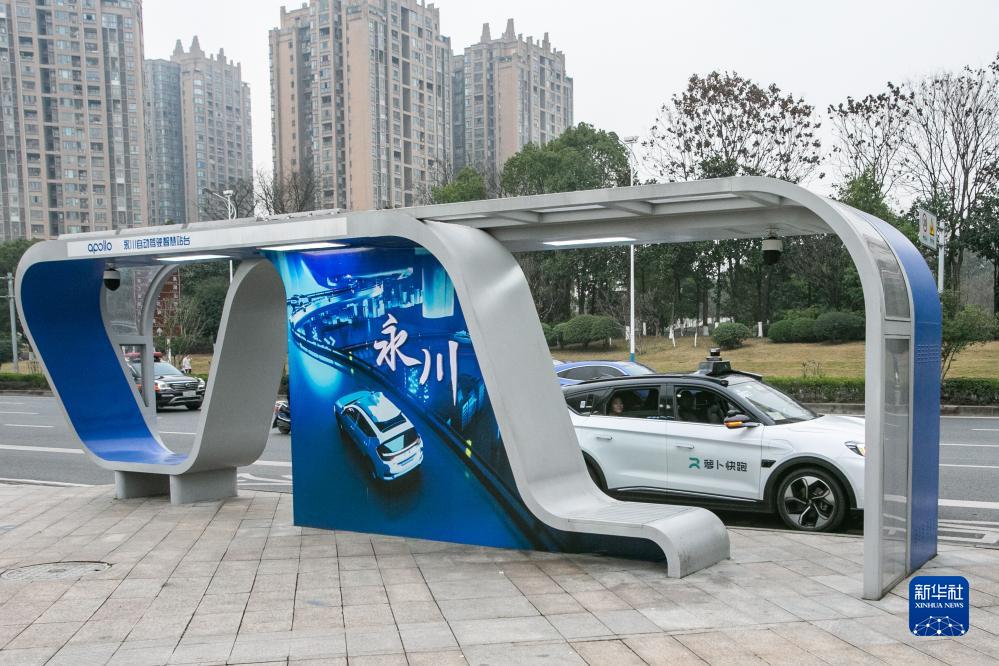 在重慶市永川區,乘客乘坐百度Apollo自動(dòng)駕駛出行服務(wù)車(chē)離開(kāi)自動(dòng)駕駛智慧站臺(3月1日攝)。