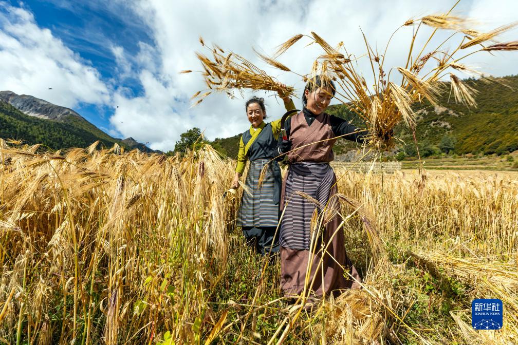 10月12日,在四川甘孜藏族自治州稻城縣亞丁村,村民格拉姆(右)和小松呷在收割青稞。