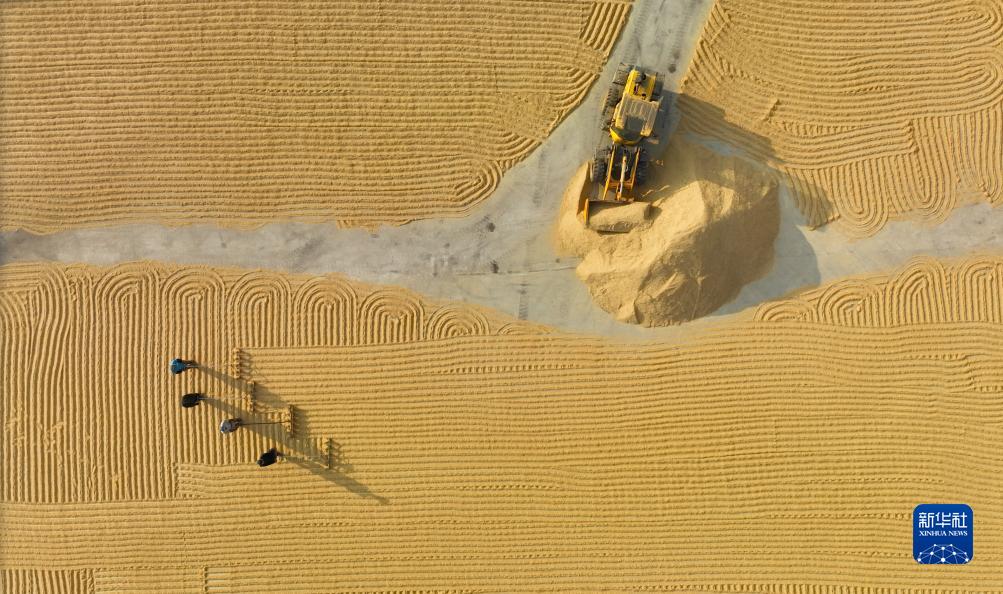 10月12日,在燈塔市禾谷茂源水稻種植專(zhuān)業(yè)合作社,農民在晾曬收獲的水稻(無(wú)人機照片)。