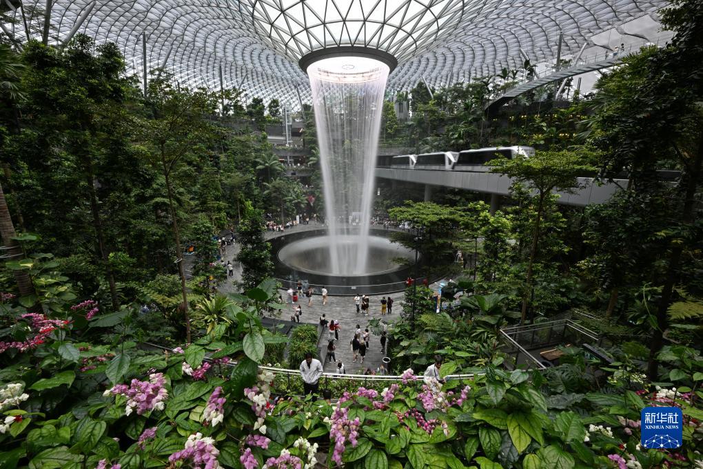 這是2023年9月7日拍攝的新加坡樟宜機場(chǎng)內的室內瀑布。