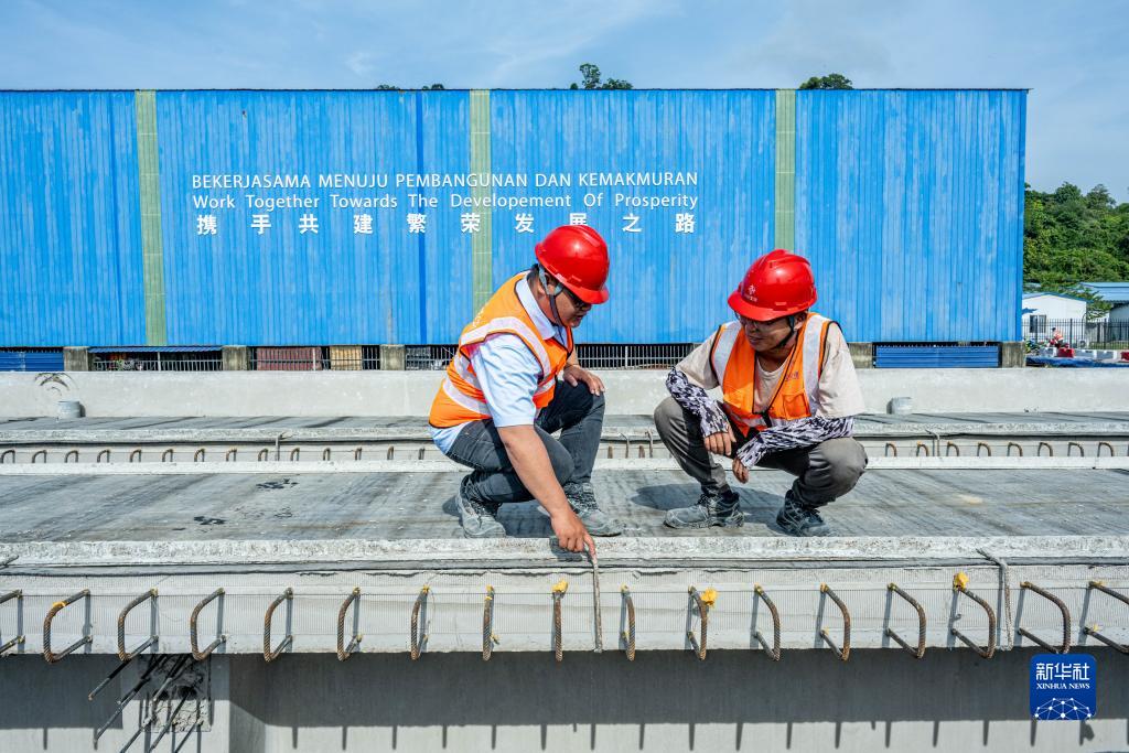 2023年4月26日,在馬來(lái)西亞吉蘭丹州的馬東鐵項目一分部制梁場(chǎng),技術(shù)主管鄧友志(右)和馬來(lái)西亞本地青年員工鄧德緯討論生產(chǎn)情況。共建“一帶一路”倡議框架下的馬東鐵項目對促進(jìn)當地經(jīng)濟發(fā)展、基礎設施建設與聯(lián)通、增進(jìn)民生福祉有著(zhù)重要作用。