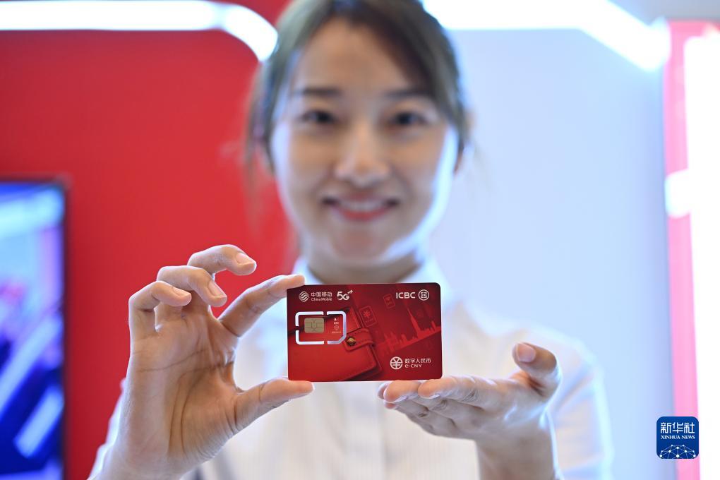 在論壇設置的數字人民幣體驗區,工商銀行展臺的工作人員展示一款工商銀行與中國移動(dòng)聯(lián)合研發(fā)的數字人民幣SIM卡硬錢(qián)包(10月12日攝)。該硬錢(qián)包支持無(wú)網(wǎng)無(wú)電支付。