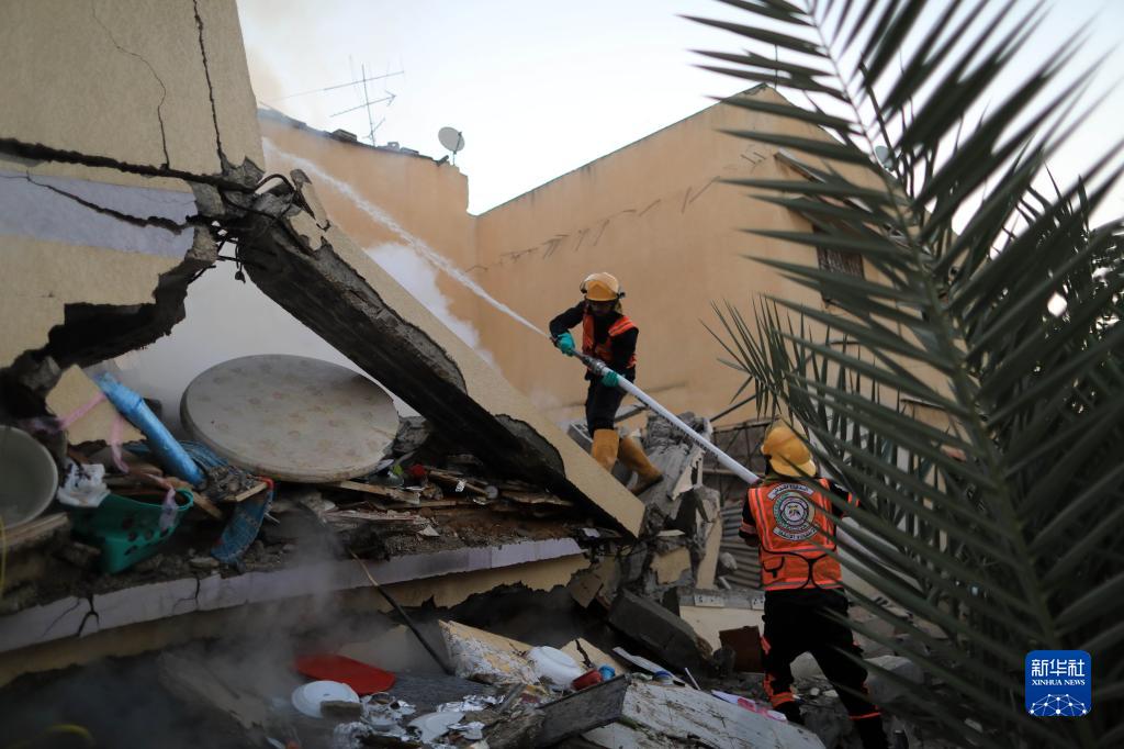 10月12日,在加沙地帶南部城市汗尤尼斯,巴勒斯坦民防人員給遭以色列空襲的建筑滅火。