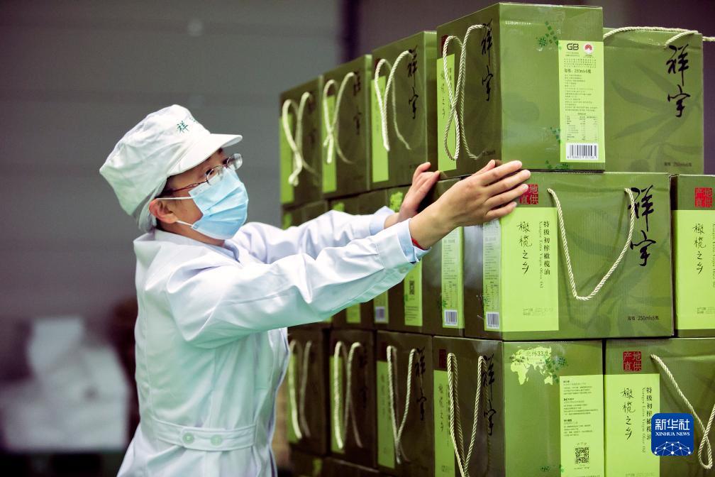 10月11日,在隴南市武都區一家油橄欖加工企業(yè)生產(chǎn)線(xiàn)上,工作人員將包裝好的橄欖油碼放整齊。