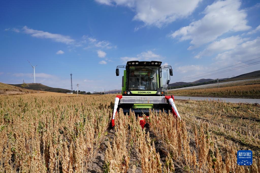10月12日,收割機在河北省沽源縣白土窯鄉陳家營(yíng)村田地里收割藜麥。