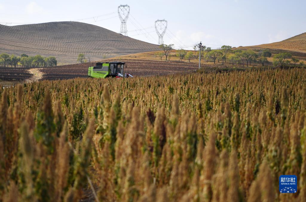 10月12日,收割機在河北省沽源縣白土窯鄉陳家營(yíng)村田地里收割藜麥。