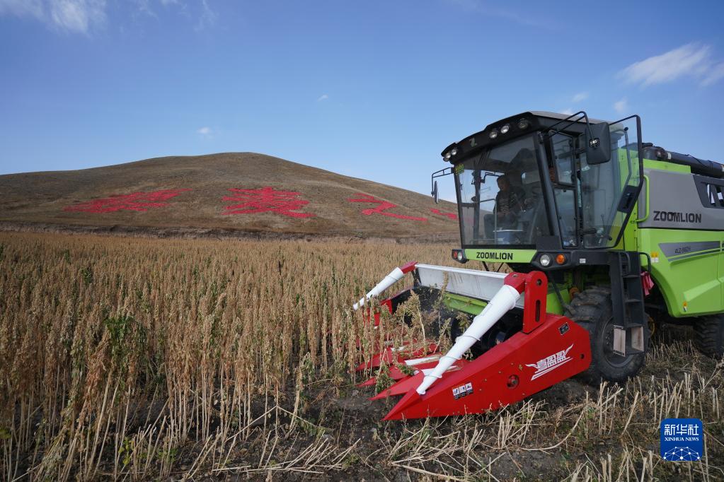 10月12日,收割機在河北省沽源縣白土窯鄉陳家營(yíng)村田地里收割藜麥。