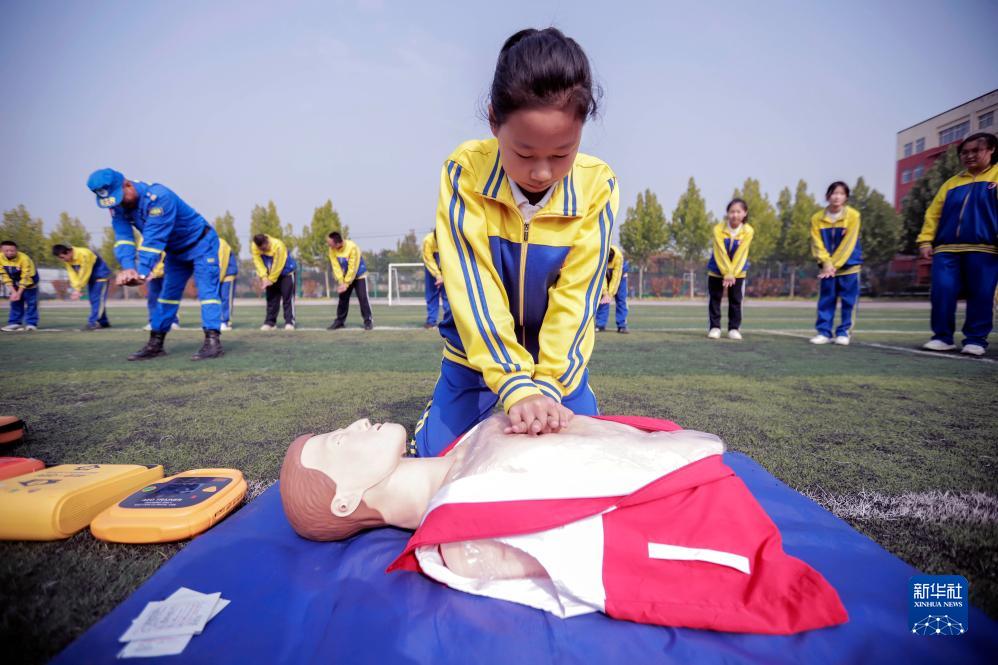 10月13日,藍天救援隊員在河北省遵化市第三中學(xué)輔導學(xué)生練習心肺復蘇技能。