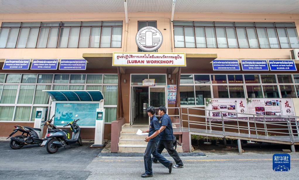 9月29日,在泰國大城技術(shù)學(xué)院,學(xué)生走過(guò)魯班工坊。2016年3月,天津渤海職業(yè)技術(shù)學(xué)院在泰國大城府建立中國在海外的首個(gè)魯班工坊。