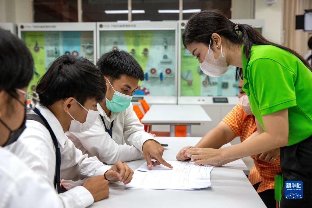 3月14日,在泰國大城府大城技術(shù)學(xué)院魯班工坊,教師(右一)給學(xué)生上課。