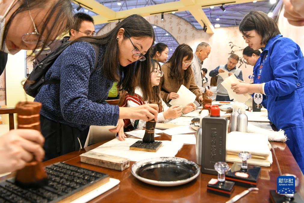 10月13日,在位于成都市世紀城新國際會(huì )展中心的2023天府書(shū)展主展場(chǎng),市民在體驗印刷技藝。