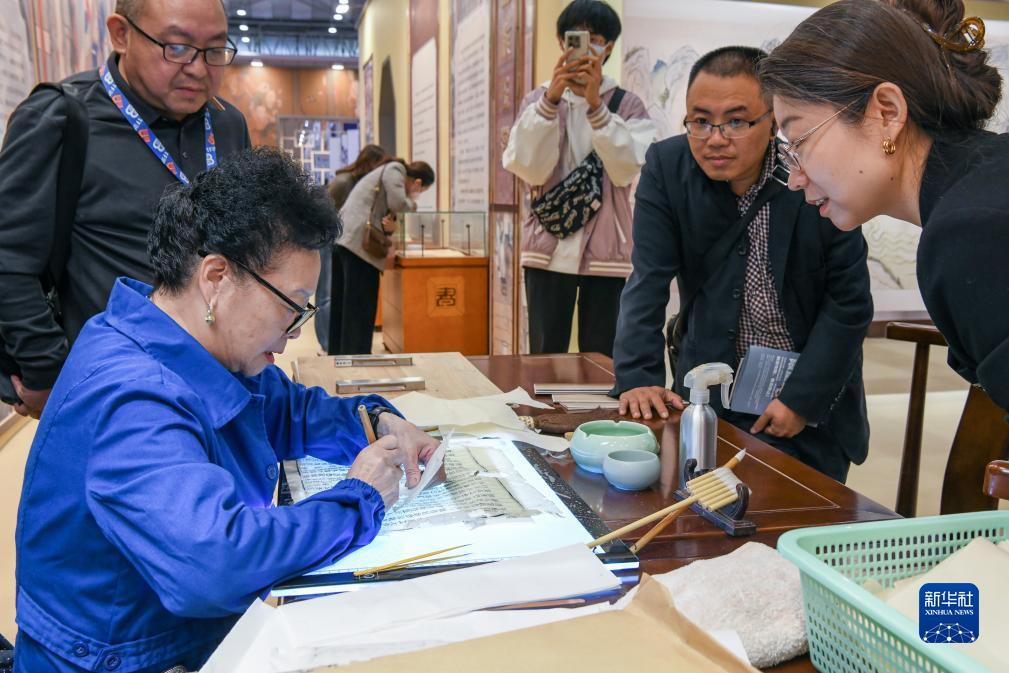 10月13日,在位于成都市世紀城新國際會(huì )展中心的2023天府書(shū)展主展場(chǎng),市民在觀(guān)看古籍修復師修復書(shū)頁(yè)。