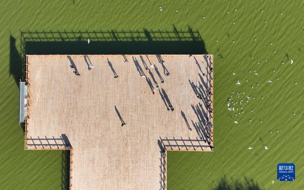 10月13日,游客在康巴諾爾國家濕地公園內游覽(無(wú)人機照片)。