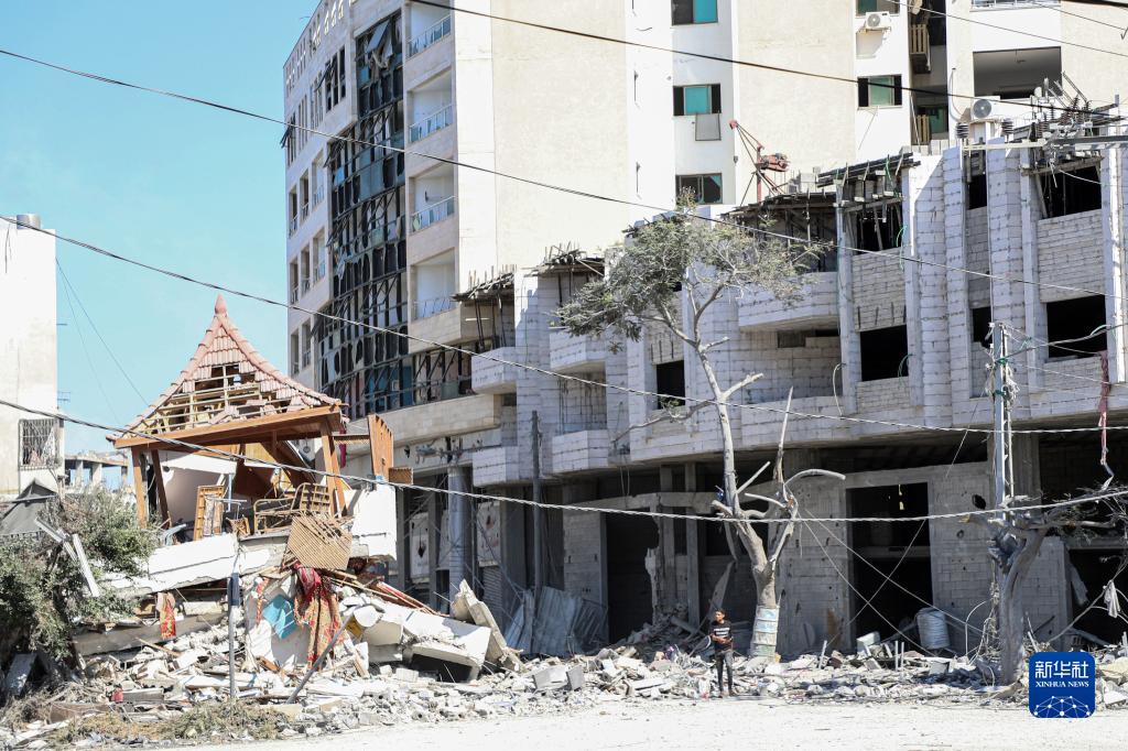 這是10月13日在加沙城拍攝的遭以色列空襲損毀的建筑。