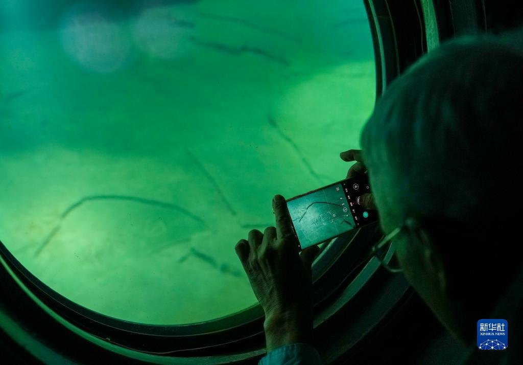 10月13日,游客在重慶涪陵白鶴梁水下博物館的水下參觀(guān)廊道內通過(guò)觀(guān)景窗拍攝保護罩內的白鶴梁題刻。