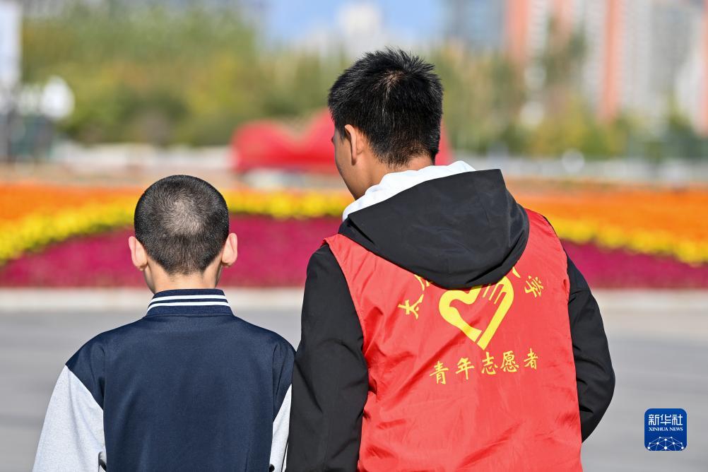 10月13日,志愿者協(xié)助盲校學(xué)生在太原汾河公園參觀(guān)。